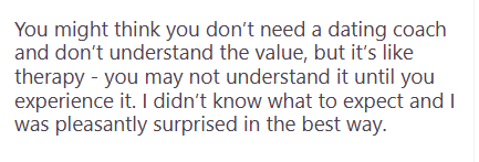 She was able to breakdown the daunting task of “dating” into smaller conversations so I could get clearer on what I was looking for, what energy I was bringing, and how to fit dating back into my life.